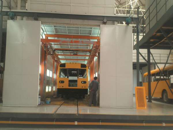 喷漆时,外部空气经过初级过滤网过滤后由风机送到房顶,再经过顶部过滤网二次过滤净化后进入房内。房内空气采用全降式,以0.2-0.3/s的速度向下流动,使喷漆后的漆雾微粒不能在空气中停留,而直接通过底部出风口被排出房外。这样不断地循环转换,使喷漆时房内空气清洁度达98%以上,且送入的空气具有一定的压力,可在车的四周形成恒定的气流以去除过量的油漆,从而大限度地保证喷漆的质量。
